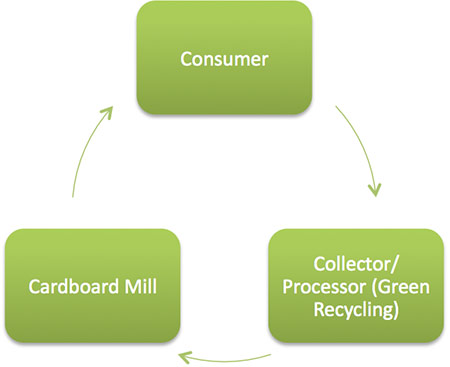 This represents the complete cycle of cardboard recycling from consumer, to collector, the processesor and the end of the chain the cardboard mill.