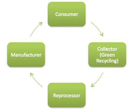 This represents the complete cycle of plastics recycling from consumer, to collector, reprocessesor and the end of the chain the manufacturer.