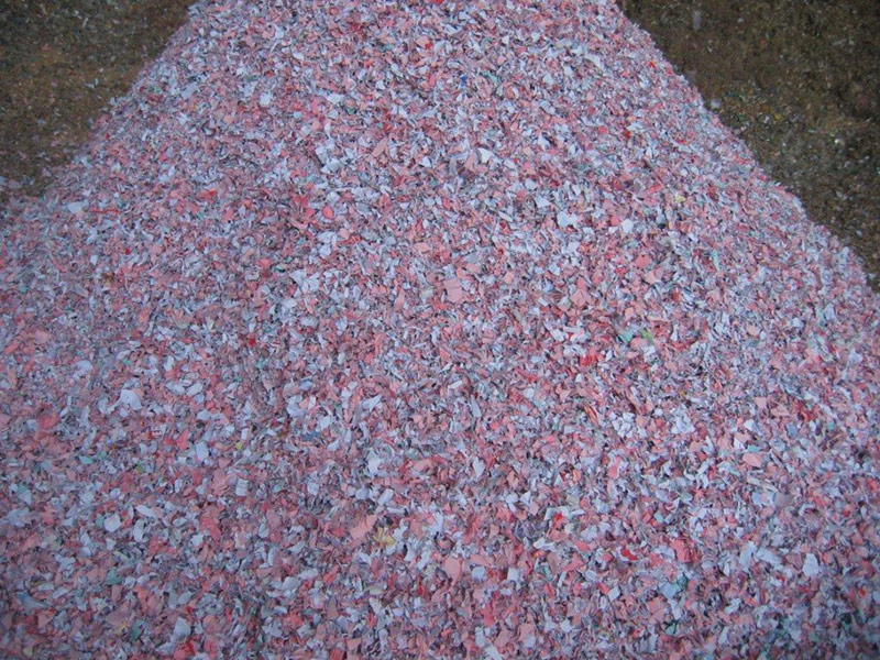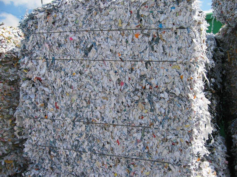 | Shredded paper baled ready for recycling. | Shredded loose invoices. | 1100 litre lockable security storage container. |